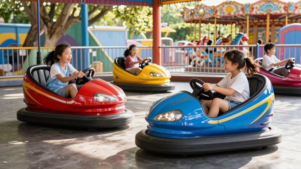 Choosing a 12V bumper car for kids means prioritizing safety features that protect them while they have fun. I always look for a 5-point harness and soft bumpers, as these are essential in minimizing injury risks. Many models comply with ASTM and CPSIA safety standards, which gives me peace of mind knowing they’ve undergone rigorous testing. I also appreciate slow start functions that prevent sudden acceleration, allowing kids to get used to the ride’s speed. Additionally, remote control options let parents oversee their child’s driving experience, enhancing safety. In conclusion, features like explosion-proof tires and sturdy construction guarantee durability and stability, greatly reducing the likelihood of accidents during those exciting 360° spins.
