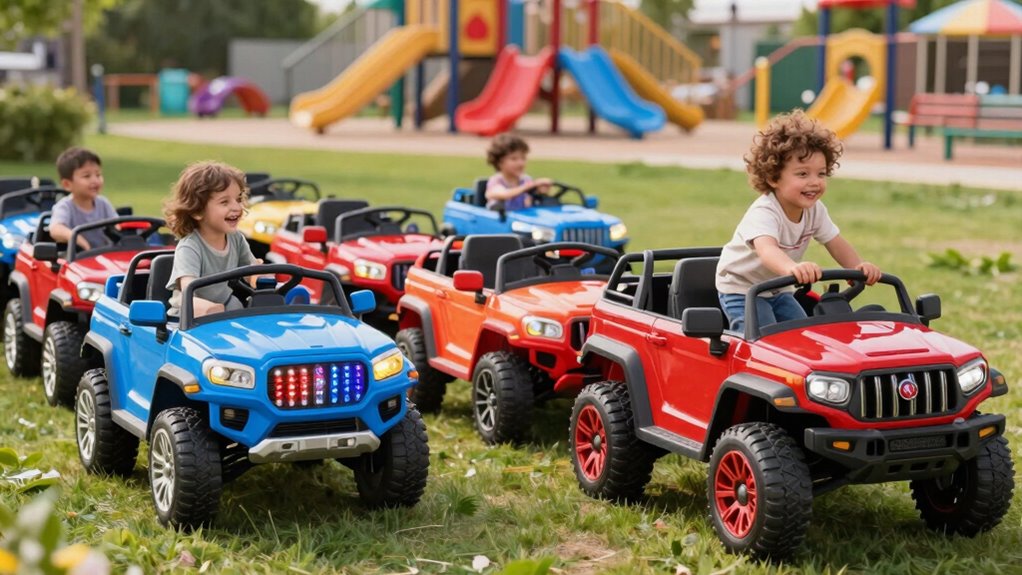 Selecting the right 12V ride-on SUV for toddlers involves considering their age and size to guarantee a safe and enjoyable experience. Most models cater to kids aged 3 to 8, making them perfect for toddlers. It’s essential to check the weight capacity, which typically ranges from 66 to 150 pounds, ensuring your child can safely enjoy the ride. Features like parental remote control and safety belts add extra security, especially for younger drivers. Adjustable speed settings are also a great option, allowing toddlers to build their confidence gradually. Finally, make sure the SUV’s dimensions suit your child’s height—many models accommodate kids under 43 inches tall, providing a comfortable and secure fit for little adventurers.