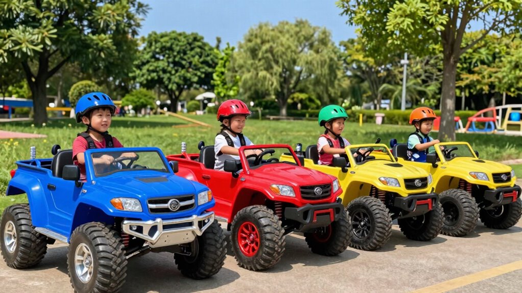 When it comes to 24V ride-on off-road trucks, the control options available can greatly enhance your child’s driving experience. Many of these trucks feature switchable drive modes, allowing you to toggle between 2WD for flat surfaces and 4WD for better traction on rough terrain. I love that parental control options are often included, letting me manage speed and direction via a remote for added safety. Some models even offer multiple speed settings, so kids can start slow and build confidence before hitting higher speeds. Plus, manual driving capabilities for older children promote independence and skill development. Safety features like soft start mechanisms guarantee gradual acceleration, preventing sudden jolts during driving. These controls offer peace of mind while keeping the fun intact!