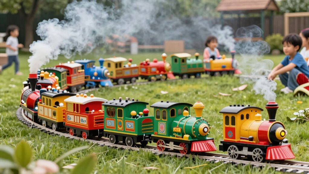 Choosing a battery-powered ride-on train involves careful consideration of age appropriateness and safety features. Most designs cater to kids aged 18 months to 8 years, ensuring they’re both engaging and safe for their developmental stages. I always check for essential safety features like protective guardrails, anti-tilt designs, and a maximum weight capacity—often between 40 to 150 lbs—to prevent accidents. It’s reassuring to find models that meet ASTM and CPSIA safety standards, confirming they’ve been tested for young children. I also look for adjustable seating and comfort features, like backrests and retractable footrests, to accommodate growth. Finally, supervision is vital; young riders should always be monitored, especially on uneven surfaces or in public areas, to minimize injury risks.