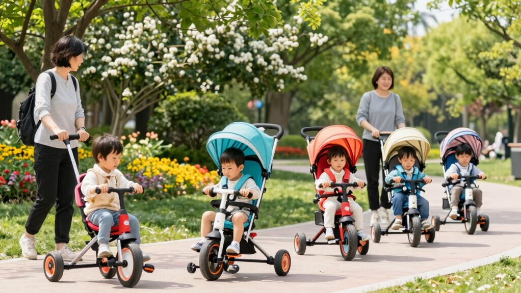 Choosing the right convertible stroller trike for your toddler can be a game changer, especially since these trikes cater to a wide age range—from as young as 10 months to 6 years old. It’s essential to select a model that aligns with your child’s developmental needs. Many trikes start in stroller mode for infants and shift to balance bikes as your little one grows. Look for adjustable components like the seat and handlebars to guarantee comfort and fit throughout their growth. Consider how the trike adapts as your child becomes more independent, moving from being pushed to pedaling on their own. This adaptability not only enhances their riding experience but also encourages their confidence and motor skills.